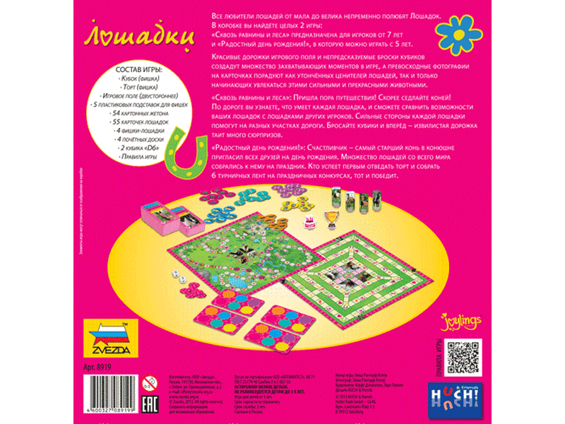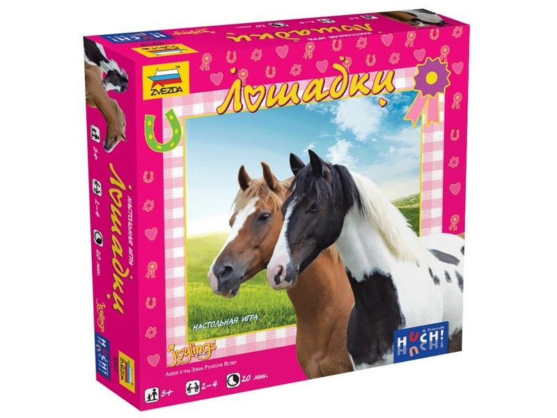 Всем любителям лошадей от мала до велика непременно понравится игра про лошадок. В коробке вы найдёте целых 2 игры: «Радостный день рождения!», в которую можно играть с 5 лет, и «Сквозь равнины и леса», предназначенную для игроков от 7 лет и старше. Двустороннее поле, простые правила и множество красивых карточек с фотографиями скаковых лошадок понравятся всем. Дети охотно возвращаются к «Лошадкам» снова и снова! «Сквозь равнины и леса Мы бежим на край земной! Там увидим чудеса И направимся домой!». Скорее ставьте лошадок на старт и оправляйтесь путешествовать: весело бегать по солнечным полянкам, пробовать новые лакомства, с осторожностью переходить автомобильные дороги, искать короткие тропы и соревноваться с друзьями в ловкости, выносливости и длине грив!