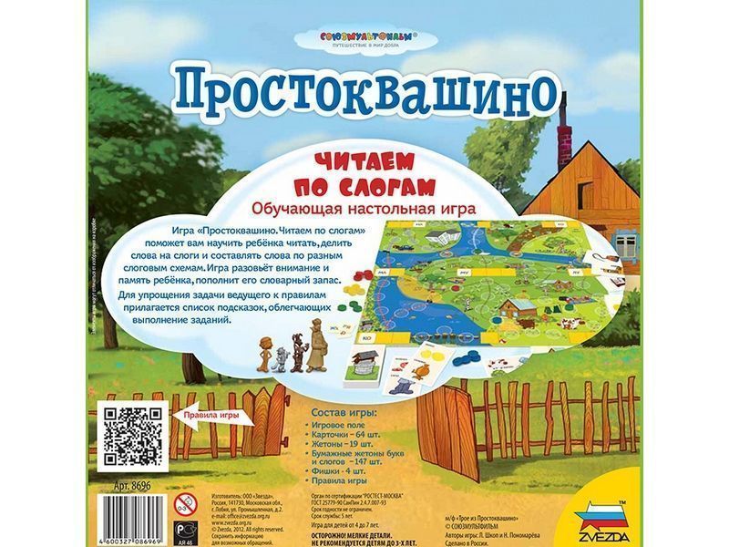 Веселая настольная игра «Простоквашино. Читаем по слогам» с узнаваемыми пластиковыми персонажами: дядя Федор, Матроскин, Печкин, Шарик понравится детям и вызовет ностальгию у взрослых. Приведённые в игре задания научат выделять различные слоговые схемы, познакомят с названиями декоративных растений и бытовой техникой. Игрокам надо собирать цветные жетоны. Для этого надо выполнить особое задание: назвать растение и подсчитать в нём количество слогов найти слово, отличающееся количеством слогов в ряду других составить слово из первых слогов двух приведённых слов придумать слово с уже предложенным слогом. Для упрощения задачи ведущего – к правилам прилагается обширный список слов, подходящих для выполнения заданий. В правилах учтены разные возрастные категории детей. Игре необходим взрослый ведущий.