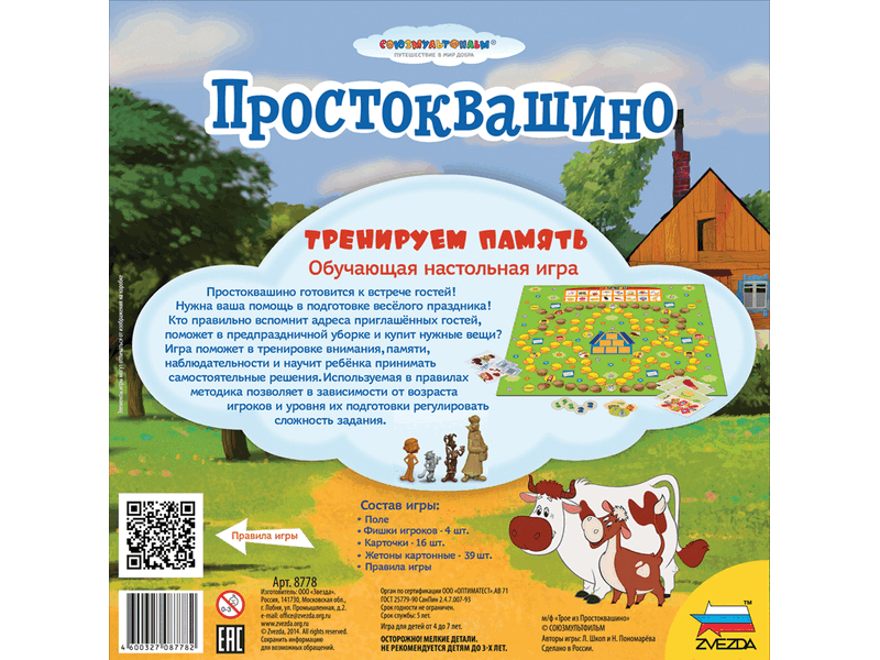 Настольная игра «Тренируем память. Простоквашино.» поможет тем, кому нужно улучшить внимание, наблюдательность и память. Игроки помогают в подготовке весёлого праздника! Перед началом игры игроки получают по 4 карточки нужных к празднованию предметов и запоминают их. После – ищут раскатившиеся монеты и разносят приглашения: поиски учат удерживать в памяти несколько задач разной степени срочности. Побеждает тот, кто быстрее всех купит нужные предметы и не ошибётся при этом. Игровой процесс позволяет в зависимости от возраста и уровня подготовки игроков регулировать сложность поставленных задач: правила содержат упрощённый вариант для недавно начавших тренировки памяти. Игре необходим взрослый ведущий.