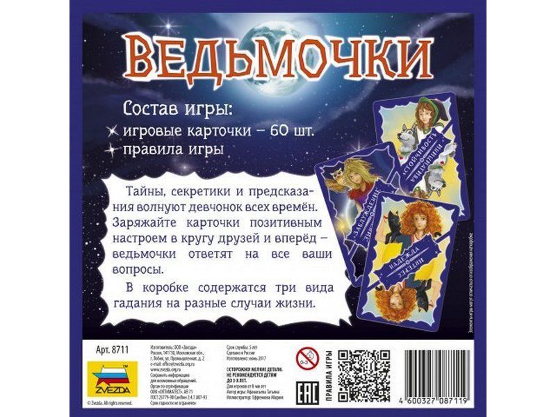Тайны, секретики и предсказания всегда актуальны. Получить ответ на сокровенный вопрос, вычислить симпатию и уловить самый правильный момент для начала действия помогут лучшие подружки – три ведьмочки из одноимённой настольной игры. Все сокровенные вопросы можно задать как в компании друзей, так и в одиночку. Заряжайте карточки позитивным настоем, энергией дружбы и любопытства – ведьмочки хотят участвовать в гаданиях и отвечать на ваши вопросы. Внутри коробки вы найдёте карточки и руководство к трём гаданиям. Каждое гадание состоит из двух частей: вначале игроки заряжают карточки волшебной энергией, а потом получают ответ на заданный вопрос. Любая часть гадания может стать независимой маленькой игрой, забавным развлечением на досуге. Для облегчения трактовки в правила включены таблицы, помогающие расшифровать смысл выпавшего.