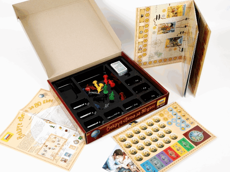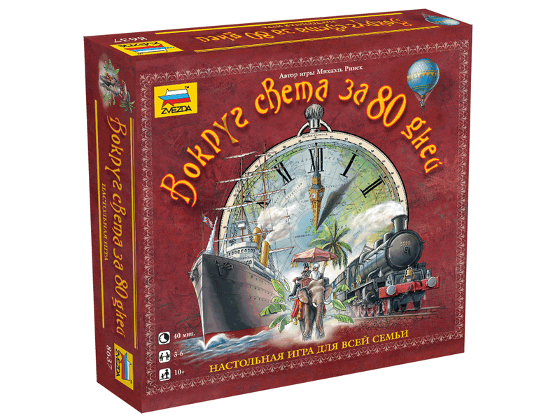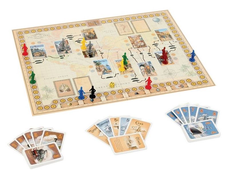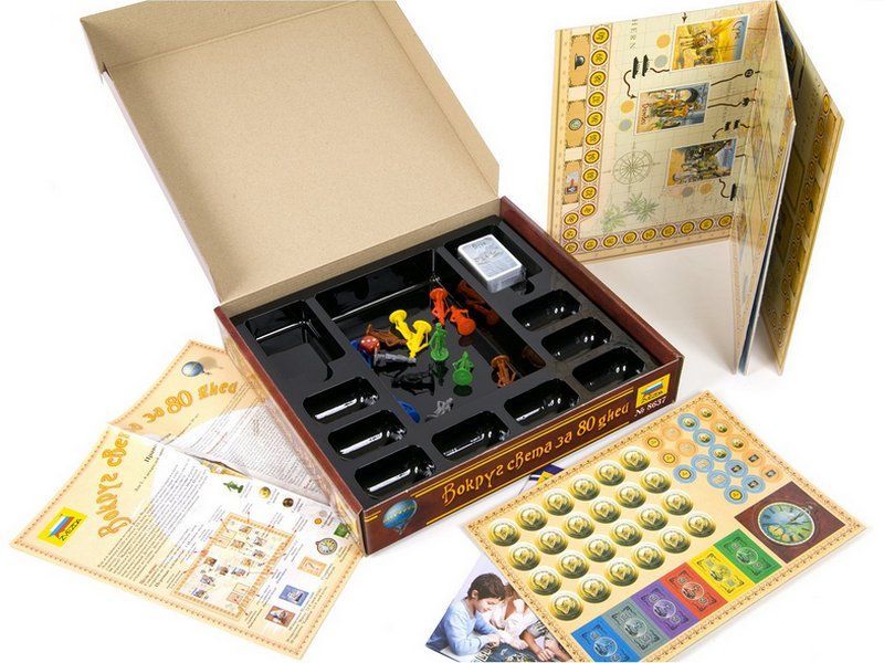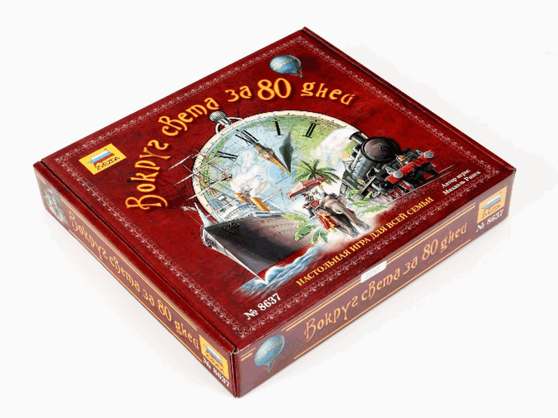 Очень интересная и увлекательная настольная игра по одноименному произведению Жюля Верна. Нестареющий сюжет, интересный дизайн. Игрокам предстоит совершить кругосветное путешествие из Лондона за 80 дней (в игре – 80 ходов). Для этого у них в распоряжении железные дороги и корабли. Игроки набирают карточки действий и исходя из них применяют различные маршруты. Побеждает тот, кто лучше всего распланирует свое путешествие.