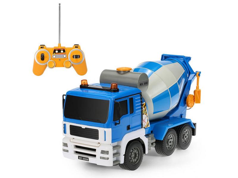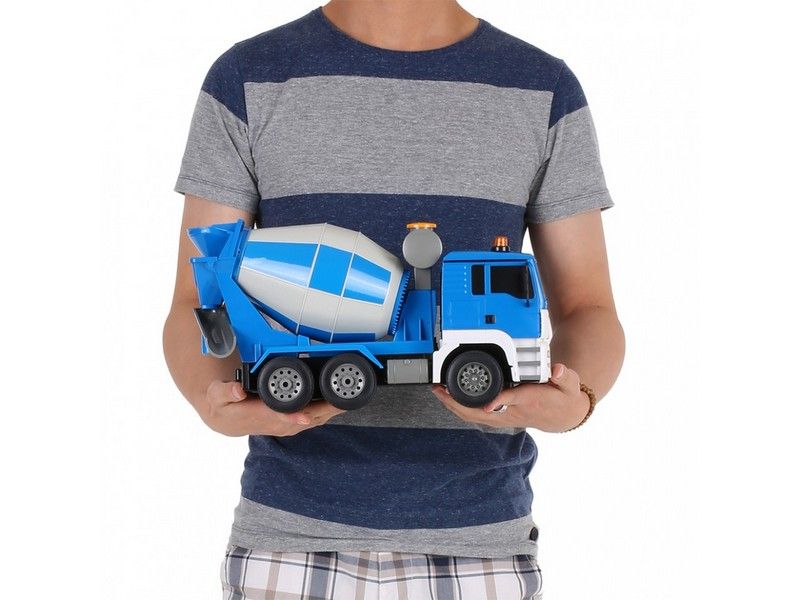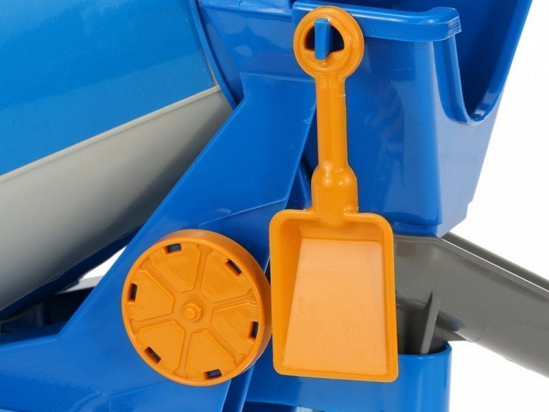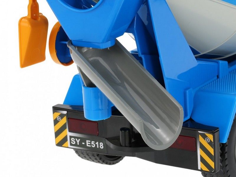 Главным преимуществом такой машинки является полноценное радиоуправление. Пульт выполнен в форме джойстика. Подобное решение будет полезно для самых маленьких, так как оно понятно на интуитивном уровне. Пульт большой и жёлтый, поэтому его сложно потерять или перепутать с другим пультом ДУ. Но самое главное — это бак для бетона. Он крутится влево и вправо. Причём, на пульте есть контроллер направления вращения. А создали установлен подвижный рог для бетона.