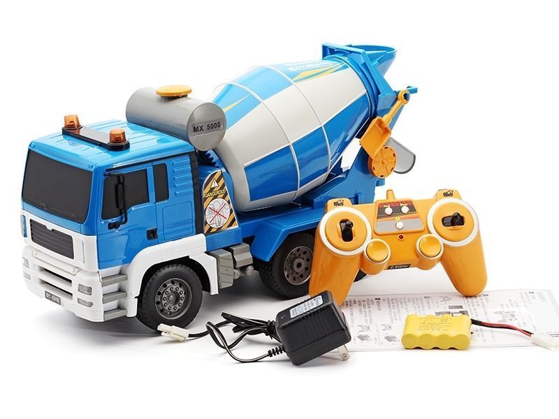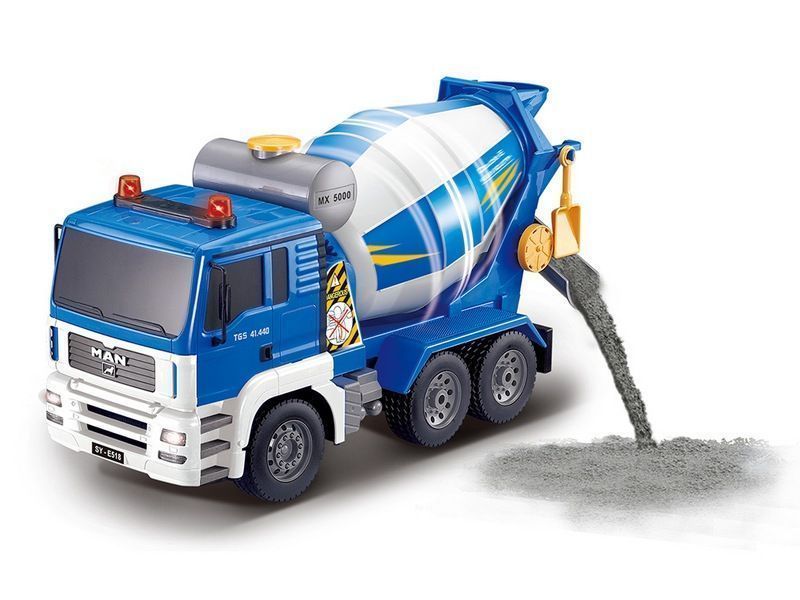 Машинка быстро набирает максимальную скорость и весьма уверенно ведёт себя не только на полу дома, но и на настоящей стройке во дворе. Работает бетономешалка от аккумулятора Ni-Cd 4.8V 400 mAh. В пульт ДУ требуется 2 батарейки. С таким набором можно легко организовать самую сложную стройку. Бетономешалка Man TGS моментально станет главным инструментом юного главного инженера.
