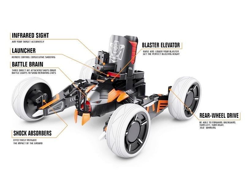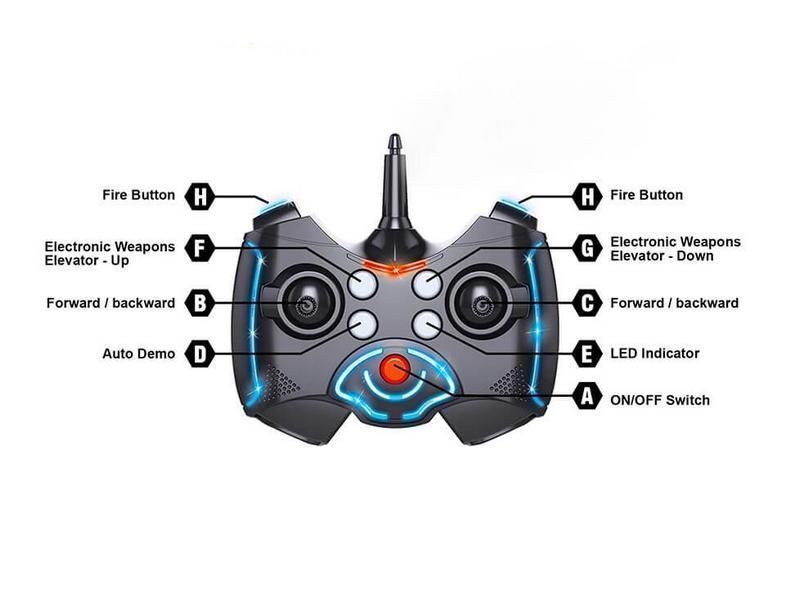 Робот стреляет пластиковыми дисками, расположенными в специальной обойме с автоматической зарядкой боевой пушки. На роботе расположена броня, которая отваливается при попадании в нее, а после трех успешных попаданий в робота, он выходит из строя. Для того чтобы вновь вернуться в игру необходимо перезапустить боевую машину. На моделе установлена светодиодная подсветка с индикацией вашей жизни, которая проинформирует вас сколько попаданий осталось до отключения вашего робота. Заднеприводные колеса позволяют двигаться во всех направлениях и делать повороты на 360°. Для более плавной езды робот оборудован амортизаторами. А для еще большей реалистичности игрового процесса, робот оснащен звуковыми эффектами.