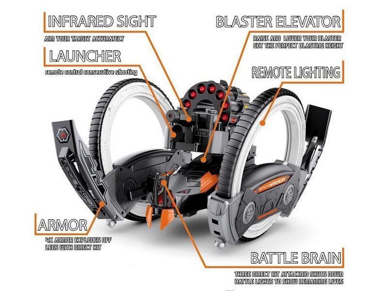 Робот стреляет пластиковыми ракетами, расположенными в специальной обойме с автоматической зарядкой боевой пушки. На роботе расположена броня, которая отваливается при попадании в нее, а после трех успешных попаданий в робота, он выходит из строя. Для того чтобы вновь вернуться в игру необходимо перезапустить боевую машину. На моделе установлена светодиодная подсветка с индикацией вашей жизни, которая проинформирует вас сколько попаданий осталось до отключения вашего робота. Заднеприводные колеса позволяют двигаться во всех направлениях и делать повороты на 360°. Для более плавной езды робот оборудован амортизаторами. А для еще большей реалистичности игрового процесса, робот оснащен звуковыми эффектами.