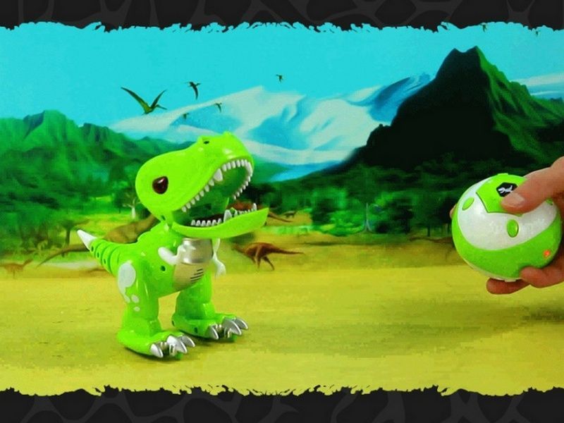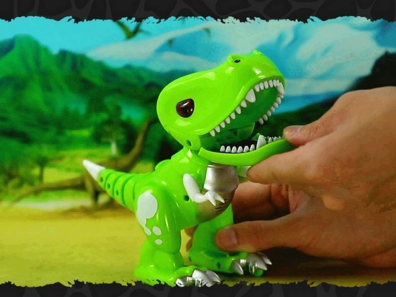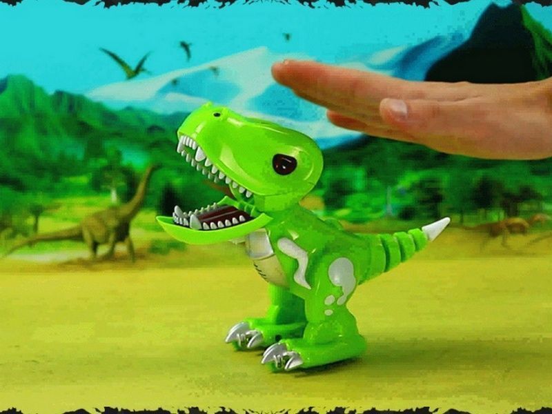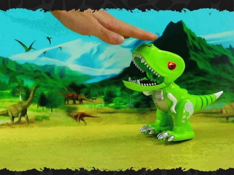 Следуя командам с пульта малыш динозавр двигается вперед, назад, влево, вправо. Не даже используя пульт дистанционного управления, можно заставить динозавра двигаться! Коснитесь сенсора на затылочной части головы динозавра, и динозавр повернется против часовой стрелки. Положите руку на голову динозавра, и динозавр автоматически продвинется вперед.