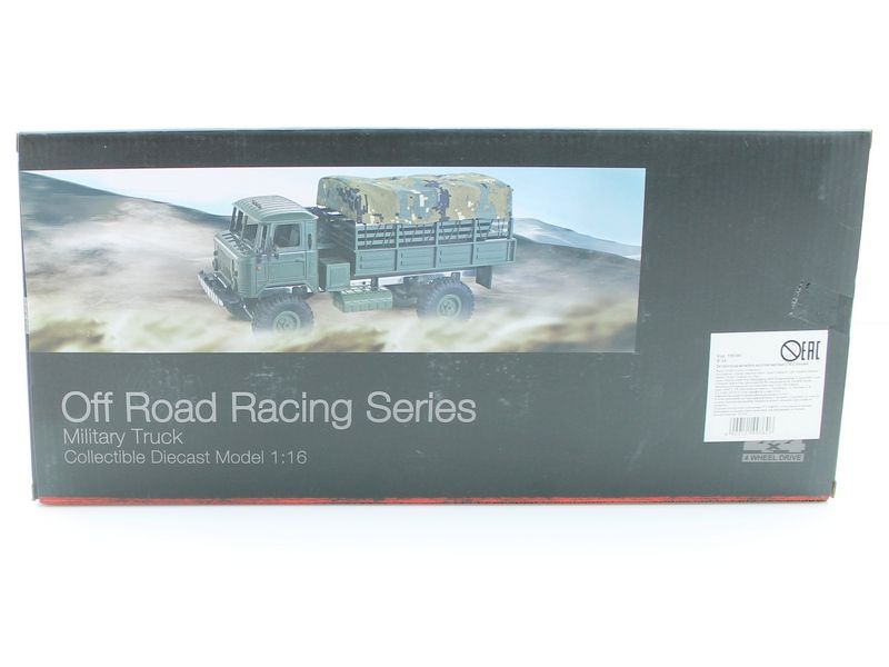 Полностью готовая модель военного грузовика масштаба 1:16 с постоянным полным приводом, коллекторным электромотором, пультом управления 2.4GHz, Ni-Cd аккумулятором и USB зарядным устройством.