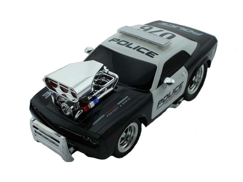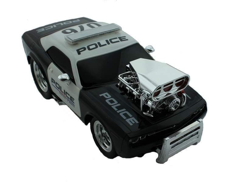 Автомобиль имеет интересный дизайн, спереди на капоте расположен гоночный мотор, который можно рассмотреть во всех подробностях. Над мотором располагается панель с яркой подсветкой. Кроме того машинка спереди оснащена огнями (свет фар) и панелью с сине-красными светодиодами. Два маленьких колеса спереди и два больших колеса сзади придает машине особый стиль. Машина имитирует четыре вида звука работающего двигателя и один звуковой сигнал. А на крыше кабины установлен проблесковый маячок полиции сине-красного цвета.