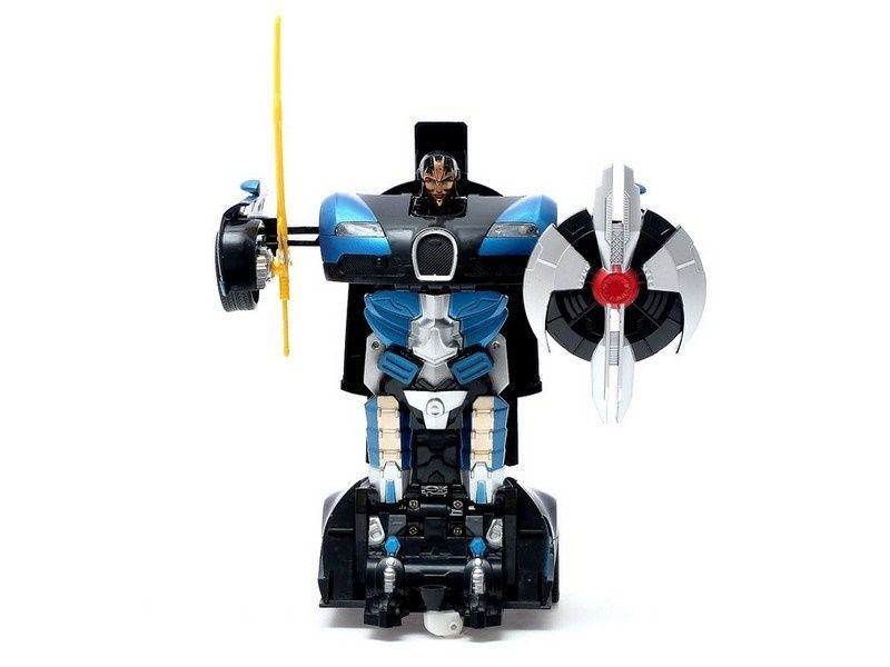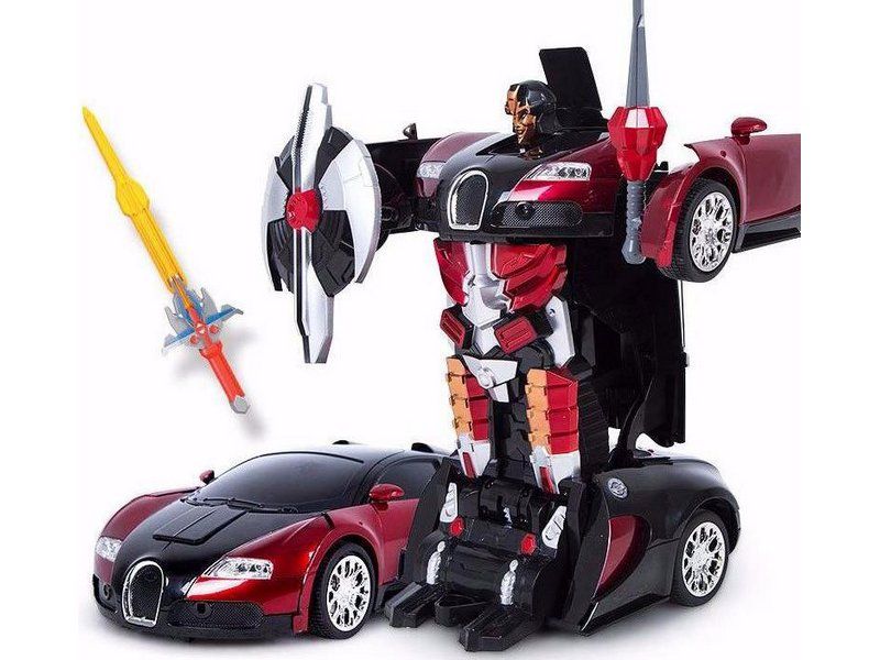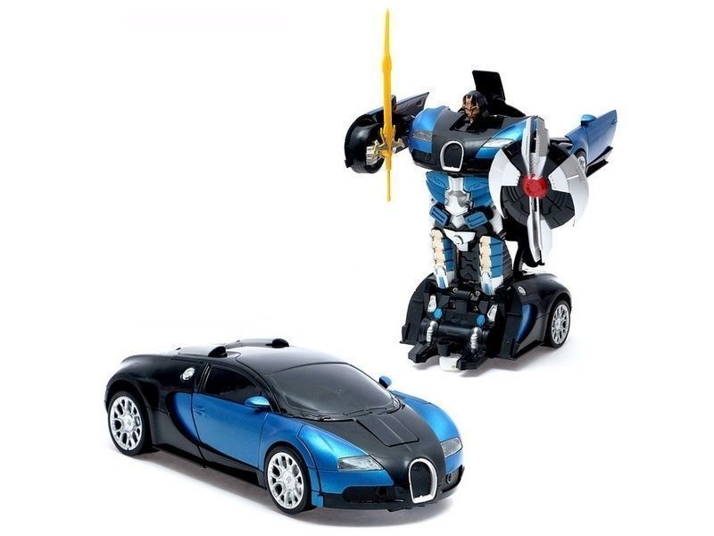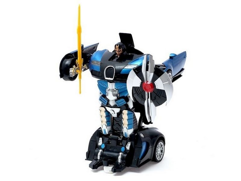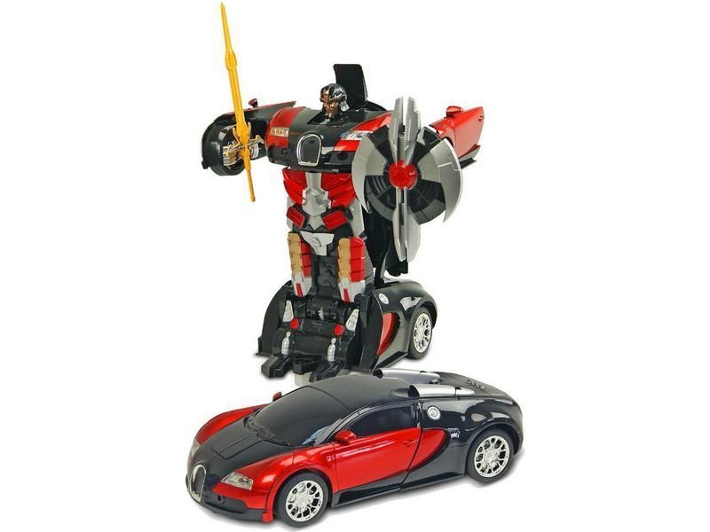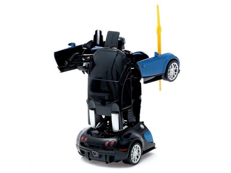 Машина трансформер выглядит как автомобиль Bugatti Veyron с высокой детализацией кузова. Модель продумана до мелочей. Имеет обтекаемые и плавные формы. Робот выполнен из прочного и высококачественного пластика, покрытого сверху ярким красящим составом, который защитит модель от загрязнений и разрушающих воздействий окружающей среды. Пульт управления выполнен в виде меча.