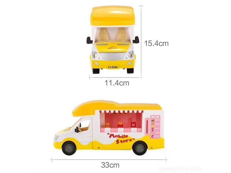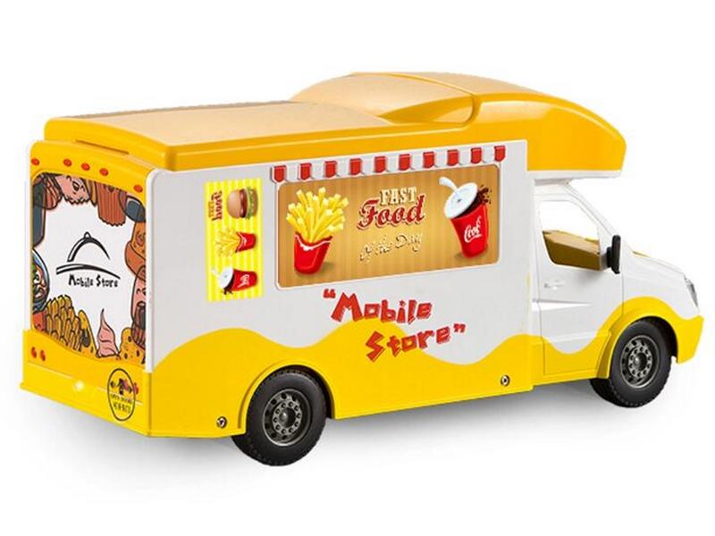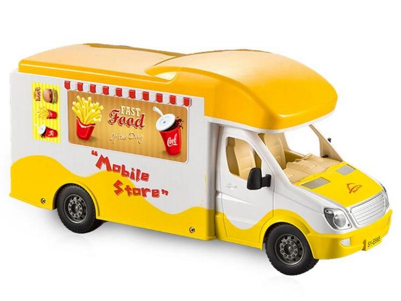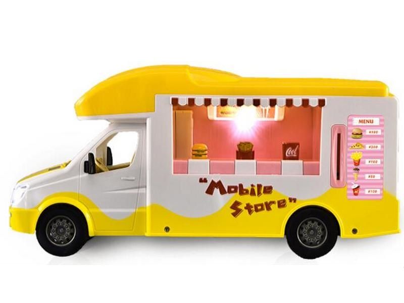 Фургон Магазин на колесах открывается дистанционно и превращается в настоящий магазин самообслуживания. Опустив монетку в монетоприемник можно выбрать себе понравившийся продукт. Монетка не исчезнет безвозвратно, ее после игры можно забрать, открыв заднюю дверь. Под потолком фургона Магазин на колесах установлена подсветка, которая активируется кнопкой на пульте.