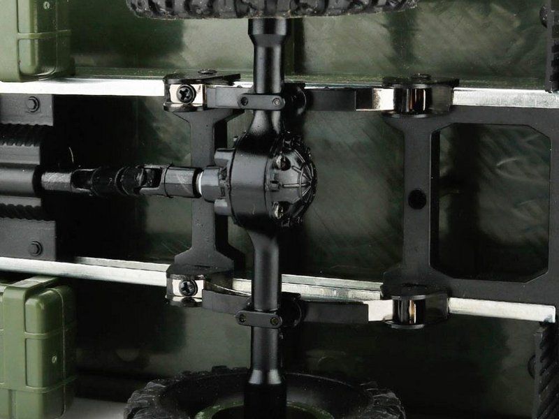 Мосты устанавливаются на металлических рессорах, что позволяет комфортно перевозить различные предметы по неровной дороге. Колеса с мягкими резиновыми шинами с агрессивным протектором позволяют миниатюрному грузовику без проблем преодолевать бездорожье и переезжать камни.