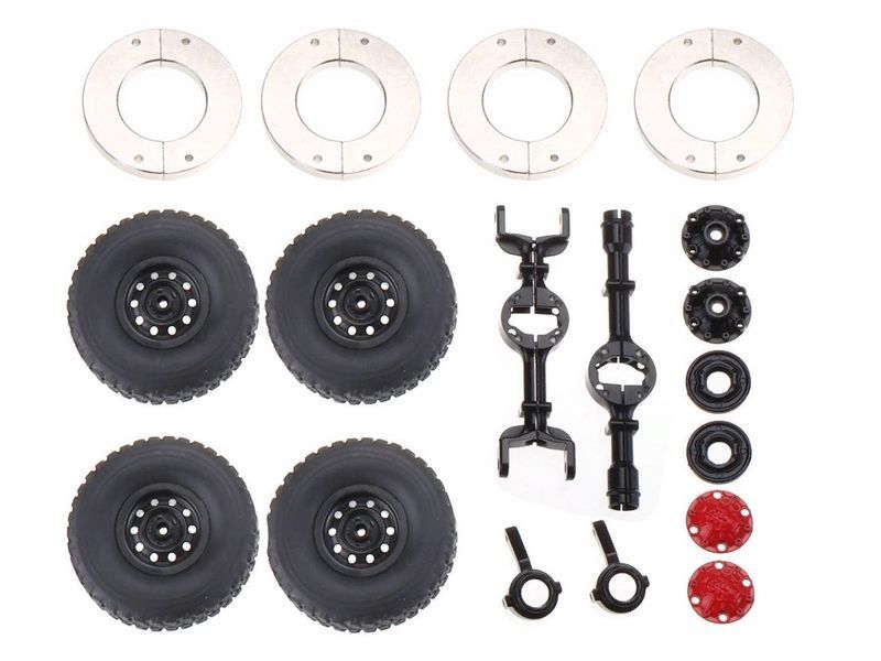 Собранный радиоуправляемый внедорожник имеет полный карданный привод 4Х4. Мосты устанавливаются на длинноходных пружинных амортизаторах, что позволяет комфортно ездить по неровной дороге. Колеса с мягкими резиновыми шинами с агрессивным протектором позволяют миниатюрному внедорожнику без проблем преодолевать бездорожье и переезжать камни.
