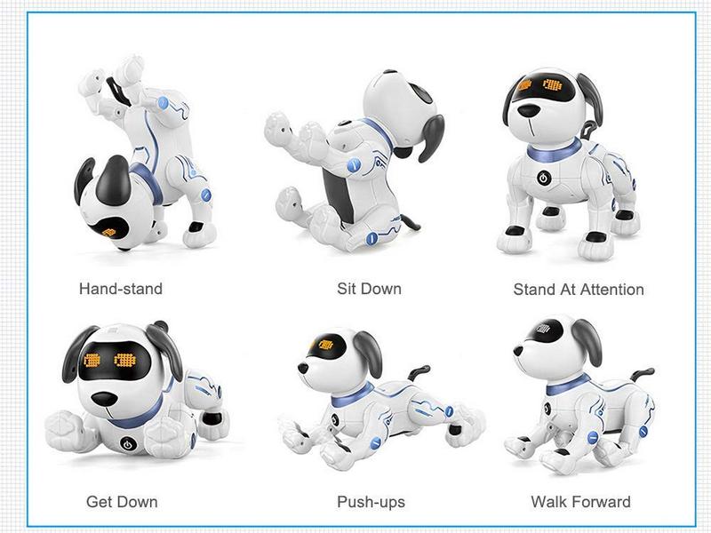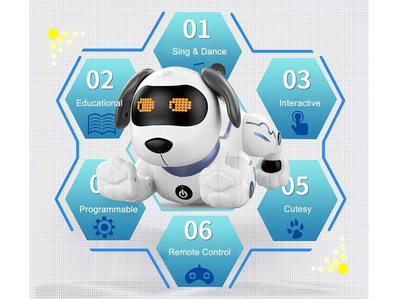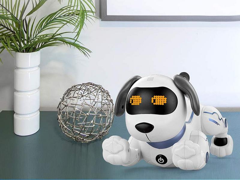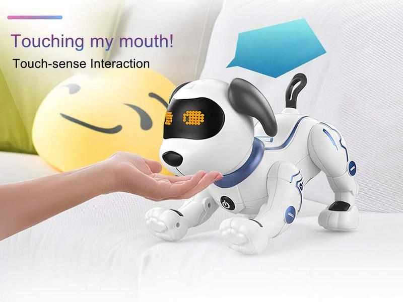 Собака может быть запрограммирована на выполнение определенных действий, стимулирующих творческий потенциал детей и тренирующих их способности. Сенсорные датчики распознают прикосновение к голове собаки.