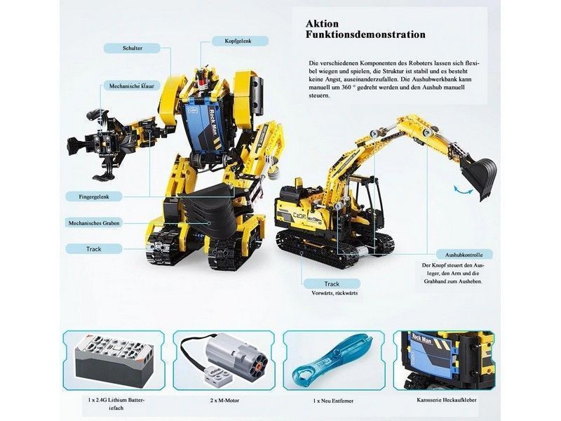 Детский конструктор CaDa С51026W представляет собой набор 2 в 1 для постройки робота и экскаватор ROCK MAN на радиоуправлении и содержит 930 деталей! Помимо деталей корпуса и колес, в комплект входят 2 электродвигателя, приемник, аккумулятор 7.4В и пульт! Детали в наборе отлично подогнаны друг к другу, поэтому сборка не вызовет трудностей, а собранная модель не развалится во время игры.