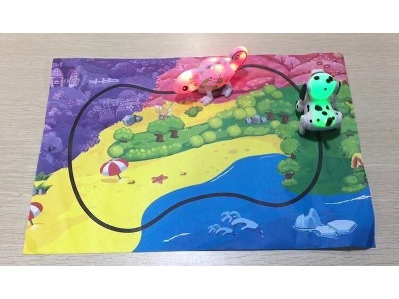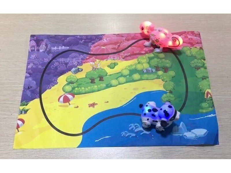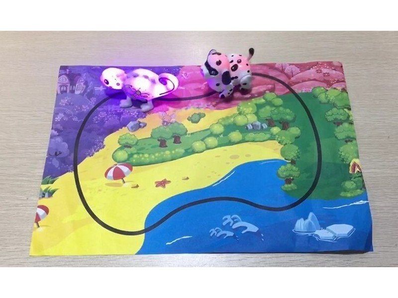 Робот-собачка умеет распознавать нарисованную для него дорогу. Едет точно по нарисованной линии и меняет свой цвет в зависимости от цвета поверхности. Нарисуйте фломастером черную линию и хамелеон будет ехать по этому маршруту. Можно как создать свой маршрут, так и использовать уже созданный на специальной карте. Придумывайте самые невероятные трассы.