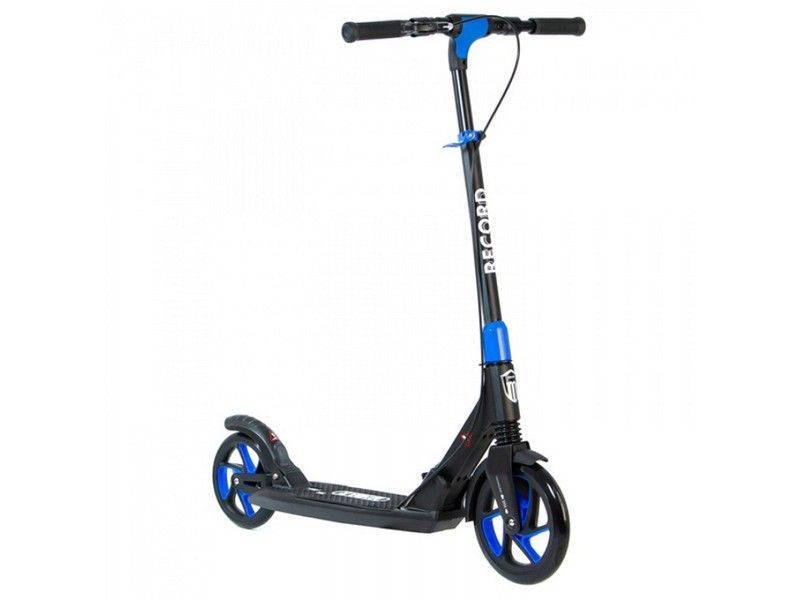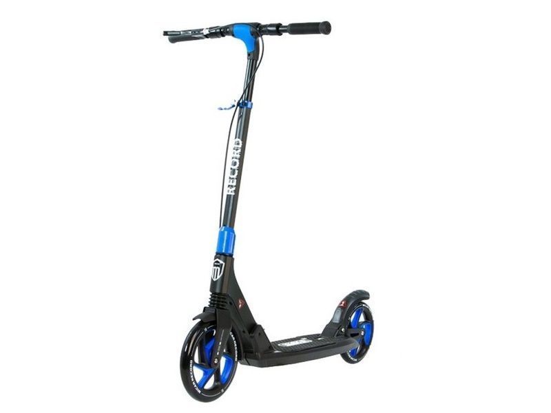 Самокат Record - это настоящий городской монстр. Преимуществом данной модели является инновационная система складывания ручек и фрезерованная рулевая стойка. Широкая платформа для ног оснащена нескользящим резиновым покрытием.