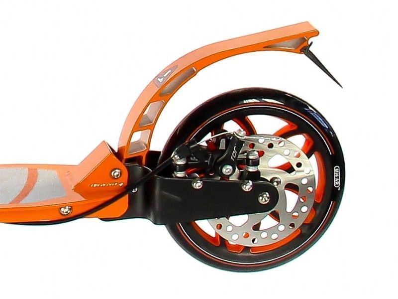 Руль самоката легко регулируется по высоте и надёжно фиксируется благодаря специальному зажиму на ручке самоката. Storm 200 мм легкий и поэтому идеально подходит для детей младшего возраста, поскольку незначительный вес позволяет переносить его через тротуар и ступени без посторонней помощи. Городской самокат оснащён ручным дисковым тормозом заднего колеса, а также удобным педальным тормозом-крылом, расположенным над задним колесом самоката.