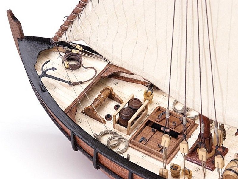 Характеристики:Материалом для постройки модели судна «Нинья» выступает дерево, при этом корпус обшивается двойным слоем реек, внутренний из которых составляет липа, а внешний - красное дерево. Создателем набора является фирма Artesania Latina, знаменитая широким ассортиментом качественных товаров. Красное дерево здесь отлично контрастирует со светлой палубой, позволяя использовать методику чернения стыков. По завершении этапа обшивки производится установка киля и штевней, также как и руля, закрепленного с помощью трех латунных петель. Визуальное восприятие экспоната усиливают темные аксессуары на палубе, в том числе пушки, люки и ограждения. В целом речь идет о небольшом изделии, которое, тем не менее, насыщено целым рядом мелких деталей, включая бочки, трапы и якорь.
