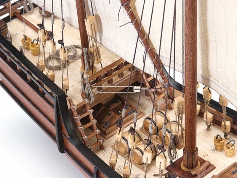 Такелажная оснастка создается при помощи нитей двух цветов, прилагающихся в комплекте вместе с самшитовыми блоками. Паруса заранее вырезаны и обшиты, что экономит время моделистов. Флаги и вымпелы отпечатаны на тканевой основе и их нужно просто вырезать. Наконец в набор включена подробная инструкция на русском языке с комментариями и пояснениями специалистов и фотографиями, демонстрирующими каждый из этапов создания корабля. Здесь же присутствует чертеж, на котором модель показана в натуральную величину.