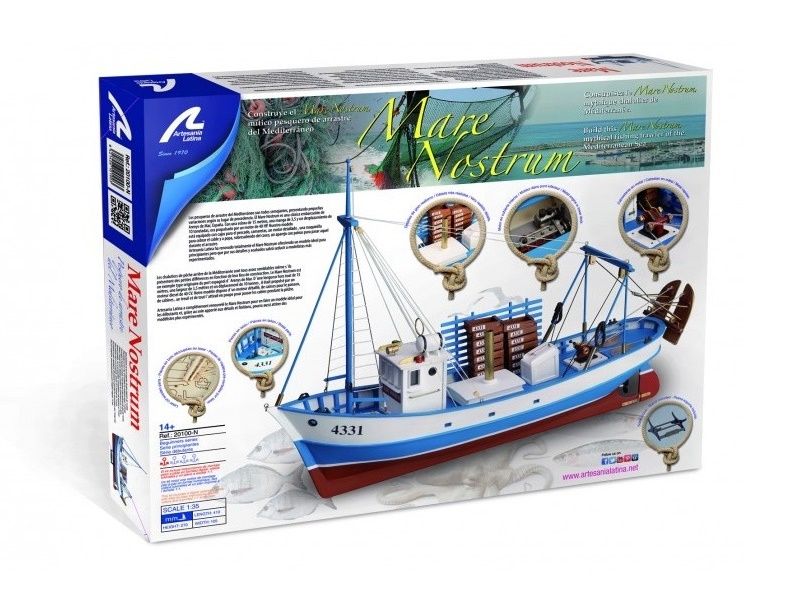 Деревянная модель корабля для сборки "Mare Nostrum" ("Наше Море") от Artesania Latina в точности воспроизводит настоящий испанский траулер, построенный в Ареньс-де-Мар (провинция Барселона, Испания). "Mare Nostrum" стал настоящей гордостью промыслового флота Средиземного моря. Траулер был оснащён дизельным мотором мощностью 40 л.с. и холодильной установкой для сохранения свежести улова.