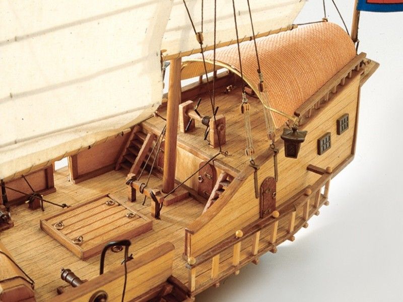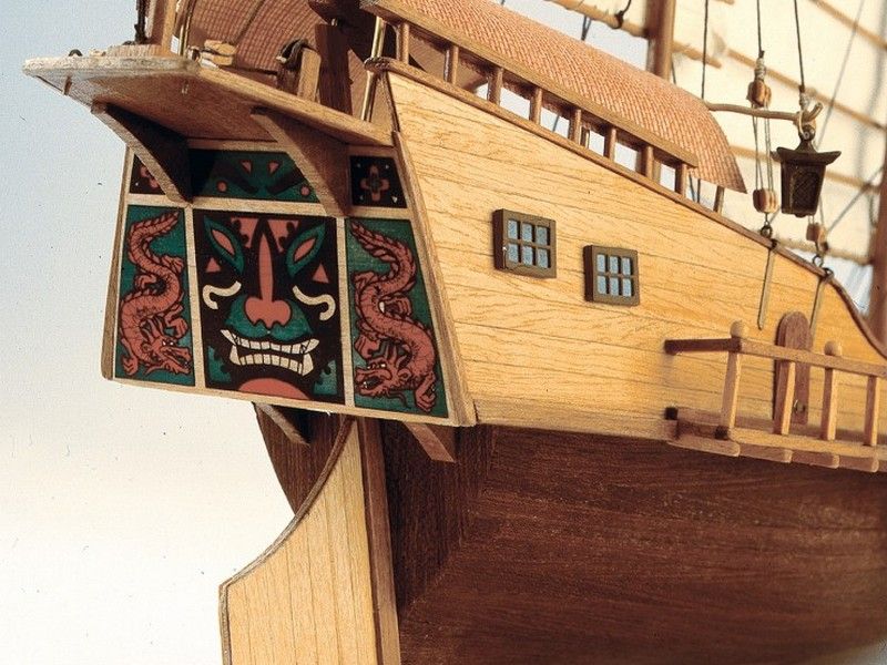 Мачты из ореха, мелкие деревянные детали из самшита. Литые пушки установлены на лафетах, палуба содержит множество элементов, в т.ч. и шпиль, люки и шлюпку. Якорь, который имеет отличную от европейского конструкцию, установлен в носовой части джонки. Изображения драконов, нити для такелажа двух цветов и диаметров, латунные гвоздики, красивая табличка с названием модели - всё это содержится в наборе. И конечно три китайских фонарика украшают кормовую часть модели. Существенную помощь при сборке окажут чертежи вместе с русскоязычной инструкцией, снабженной комментариями и цветными иллюстрациями, подробно описывающими каждый этап производства.