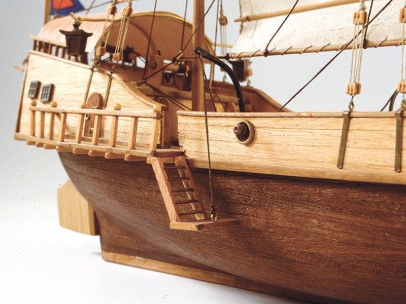 Максимально приближенный к оригиналу, эта деревянная модель корабля для сборки включает в себя детали для изготовления корпуса, рангоута, такелажа, всех деталей интерьера судна и ткань для парусов. Наборная конструкция корпуса с двойной обшивкой, киль и шпангоуты уже вырезаны и вам нужно только отделить их от основы. Чистовая обшивка из экзотического дерева сапели с отделкой тонкими ореховыми рейками. Материал дан с запасом, об этом можно не беспокоится.
