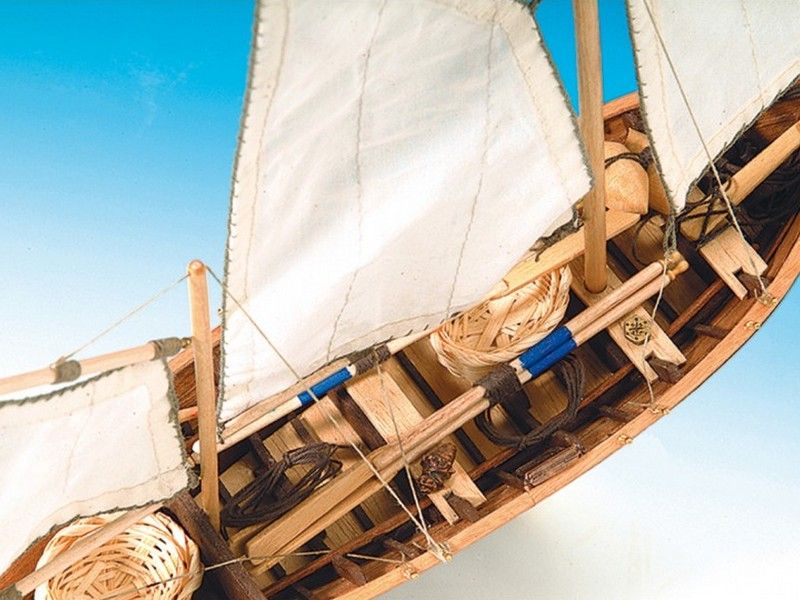 Затем автору предстоит установить палубные элементы. Все они присутствуют в наборе, отличаясь хорошей проработкой, в частности речь идет о веслах, якорях, снастях, поплавках и корзинах для улова, подчеркивающих функциональное назначение корабля. Для мачт в комплект входят специальные заготовки, которые удачно сочетаются с цветом палубы и корпуса. Некоторые детали выполнены из металла, это нагеля и рымы. Такелажная оснастка выполняется с помощью нитей разного цвета и диаметра. Паруса даны в уже готовом виде, избавляя автора от дополнительных хлопот. Приятным сюрпризом станет подставка, на которой расположено название судна. Кроме того, для такой, казалось бы простой, модели корабля для сборки, Artesania Latina разработала пошаговую инструкцию с 26-ю цветными фотографиями, которым помогает цветной чертеж общего вида и чертежи проводки такелажа. Готовая модель качественно дополнит любую коллекцию, а набор станет отличным подарком.