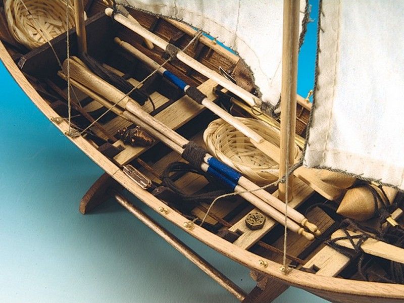 Его основным преимуществом оставалась скорость, благодаря которой заказчик всегда мог рассчитывать на свежий улов. Движение осуществлялось с помощью косых парусов. Они располагались на корме в носовой части и в середине лодки. Управление осуществлялось командой в количестве 2-3 человек, поскольку больше судно просто не вмещало. Именно поэтому оно стало популярным у рыбаков, ведущих частный промысел недалеко от берега. Впоследствии данные суда служили в течение нескольких десятилетий. Их не смогли вытеснить даже моторные образцы, а сами лодки стали одной из достопримечательностей французского побережья.Набор для постройки модели судна в масштабе 1:20 изготовлен специалистами компании ARTESANIA LATINA. В готовом виде ее длина составит 345 мм, ширина – 90 мм, высота – 220 мм. Корабельный корпус выполняется вверх килем. Для этого используется специальная платформа, после монтажа к нему приклеивают дно, а затем обшивают рейками. Данные элементы выполняются из ореха, что придает изделию особую элегантность. По окончании процедуры верхние части шпангоутов отпиливаются. Они выполняют удерживающую роль, и после их удаления изделие получает готовый интерьер. Элементы каркаса вырезаны с использованием лазера, что придает модели точеные формы.