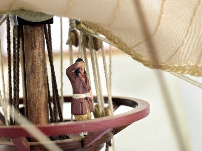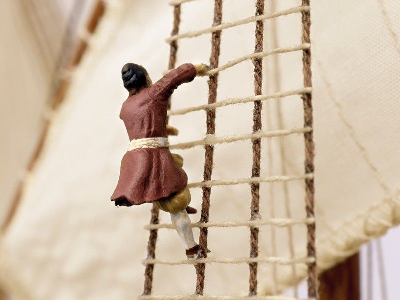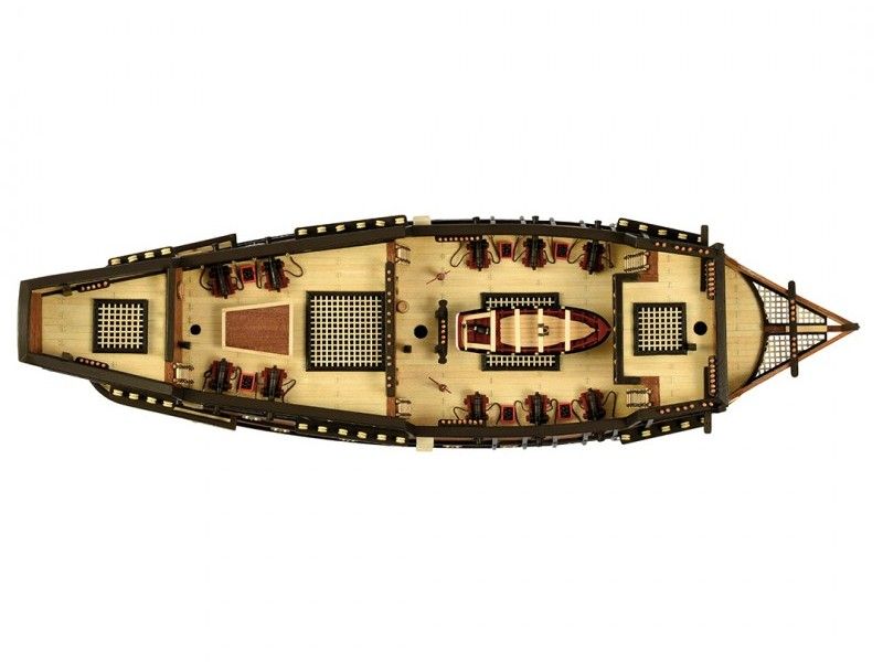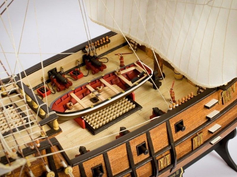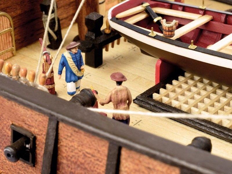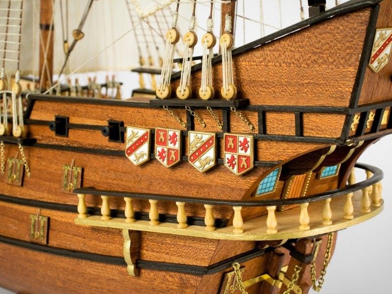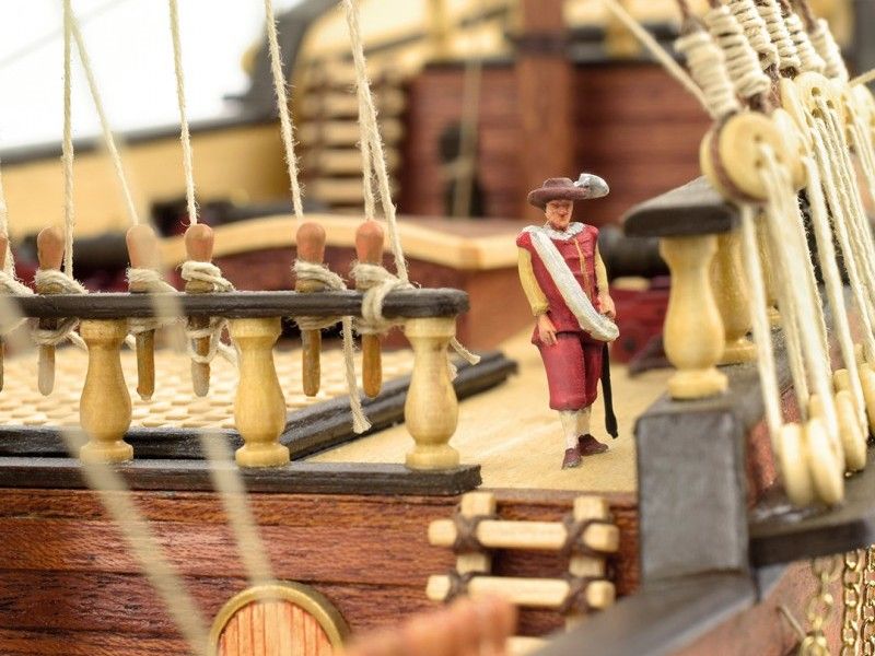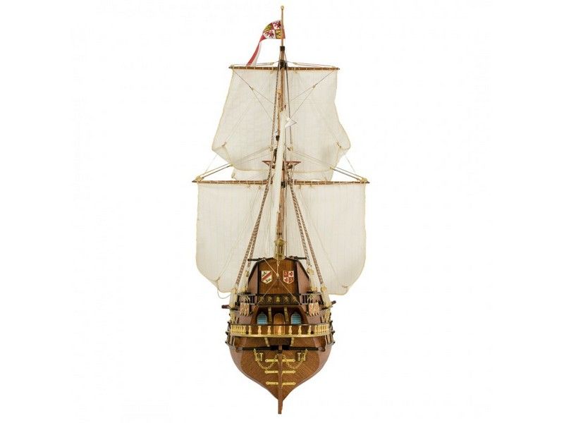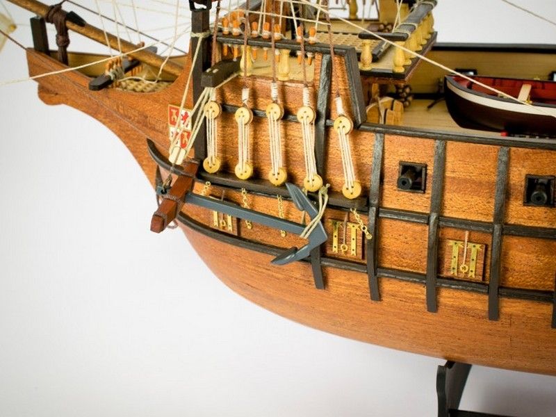 Декоративные элементы корпуса включают в себя металлические пушечные порты (открытые и закрытые), двери, щиты с гербами, деревянные детали конструкции, кормовой балкон с красивым ограждением, действующий руль на трех петлях, кран-балки и металлические решетки гальюна. Единственная шлюпка дана металлической отливкой с хорошей проработкой деталей. Тем не менее изготовитель предлагает сделать из дерева планширь, банки и уключины. Вооружение корабля состоит из 10 пушек на открытых палубах и 4-х фальконетов на вертлюгах. Пушечные станки, как и решетки, двери, помпы, белясины, трапы, якоря, фонарь, марсы, эзельгофты, румпель и якоря даны металлическими отливками. Рангоут модели выполняется из темных ореховых заготовок, блоки и юферсы выполнены из светлого самшита, для такелажа используются светлые и темные нити четырех диаметров в девяти катушках. Всего на такелаж предусмотрено 76 метров нитей и более 150 блоков и юферсов. Все шесть парусов идут как готовыми, так и даны их выкройки для самостоятельного изготовления. Завершает модель корабля элегантная подставка с двумя яркими держателями.