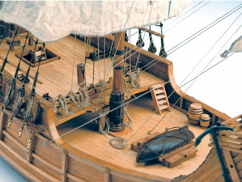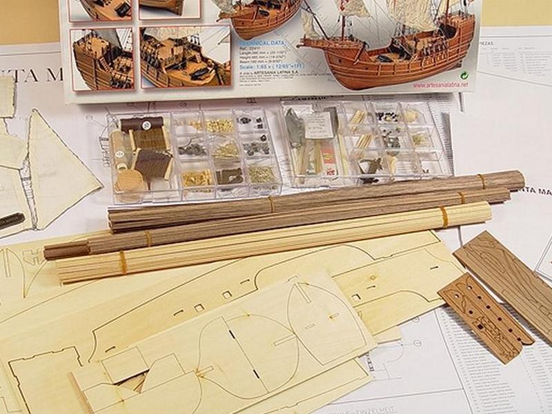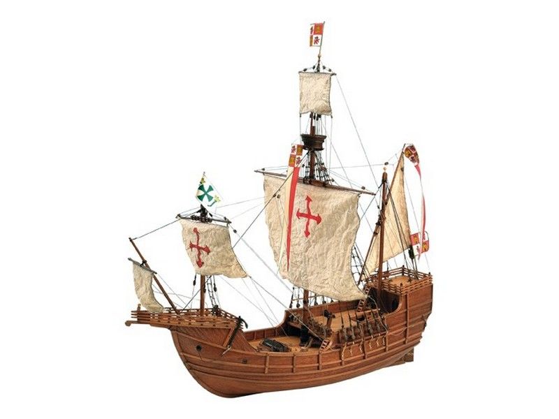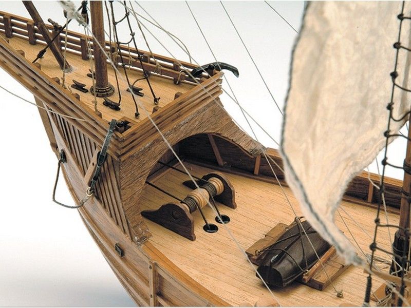 Стандартный каркасный наборный корпус имеет двойную обшивку и цельные (обшиваемые с двух сторон орехом) фальшборта с прорезанными пушечными портами. В контраст с темным ореховым корпусом настил палубы выполнен светлыми рейками, что позволяет применить технологию чернения стыков. Киль и штевни ставятся уже после полной обшивки корпуса, так же, как и поворачивающийся руль на трех латунных петлях. Для усиления визуального восприятия модели многие элементы на палубах сделаны темными. Это относится к люкам, ограждениям, кницам, пушкам и т. д. Хотя модель небольшая, но весьма насыщена мелкими деталями, не говоря уже о кормовом фонаре, шлюпке, трапам, шпиле и всевозможных трапах. Вооружение Santa Maria состоит из четырех пушек 15-го века и двух фальконетов. Для такелажа используются нити двух цветов и нескольких диаметров, правильные треугольные юферсы и около пятидесяти блоков. Паруса набора даны уже готовыми, вырезанными по форме и обшитыми. Флаги и вымпелы отпечатаны на ткани. Инструкция по сборке состоит из двух частей, в первой даны 27 фотографий всех этапов по изготовлению корпуса и всего, что с ним связано, а на двух больших листах чертежей показан рангоут и такелаж.