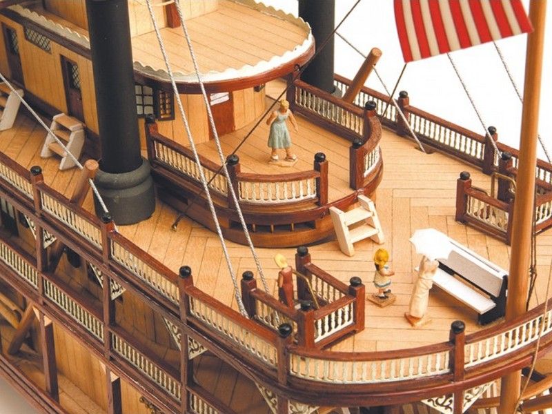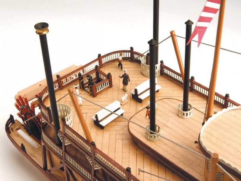 Набор для постройки модели парохода «Король Миссисипи» представлен компанией Artesania Latina. Здесь имеет место усовершенствованная корпусная конструкция, речь идет о плоскодонной модели, вследствие чего обшивка производится из трех деталей, а именно сплошных бортов и днища. Это делает процесс достаточно легким и быстрым, а второй слой обшивки, для которого используются рейки из темного ореха, делает изделие очень привлекательным и элегантным. При этом орех отлично гармонирует с палубой, которая так же, как и капитанский мостик, обшивается слоем реек, но уже светлого оттенка. Форма настила при этом отличается, и на первой палубе это классический тип, а на других - рейки выкладываются елочкой. Некоторые окна и двери имеют действующую конструкцию.