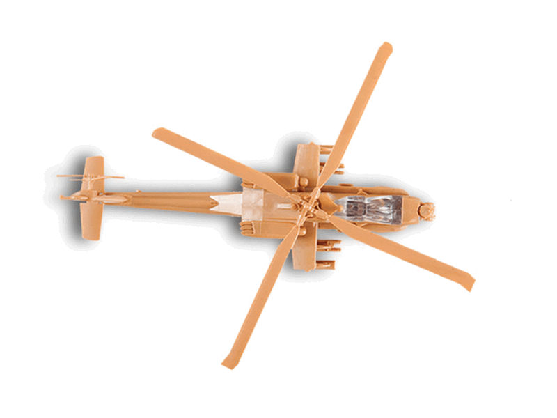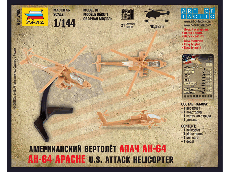 Американский ударный вертолет Апач, в "модельном" масштабе 1/144, ставшая уже традиционной простая и быстрая сборка без клея, отличная проработка деталей. В игровой системе "Hot war", Апач станет великолепной огневой поддержкой с воздуха и основным истребителем танков.