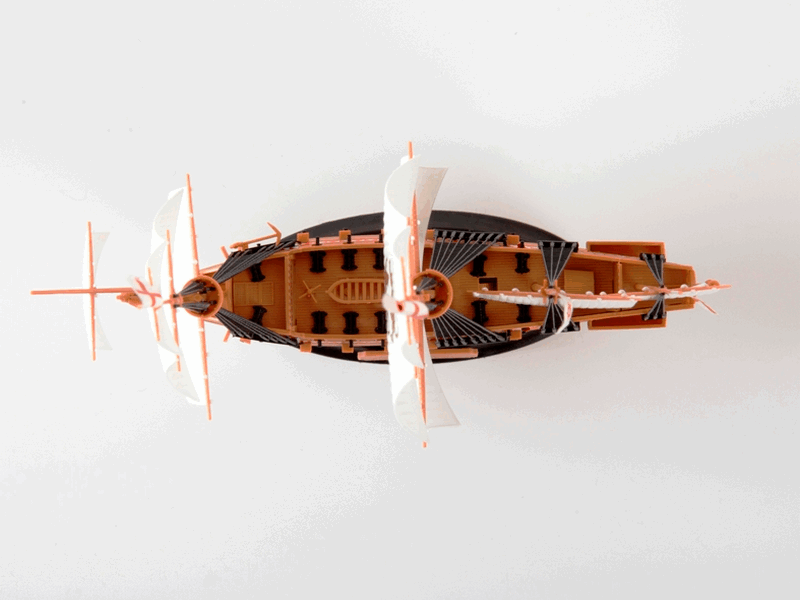 Мачты, ванты, якорь, руль, шлюпка и другие подробности.