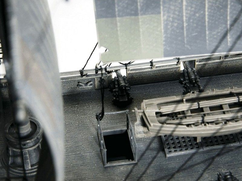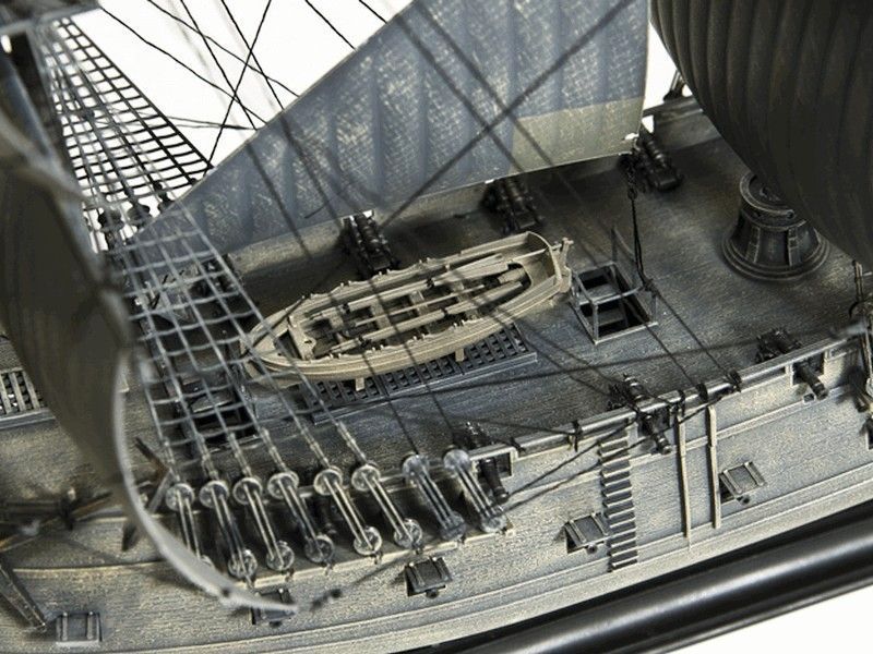 Детализированный корпус с имитацией деревянной поверхности, проработанные верхняя и орудийная палубы, пушки, детали из прозрачного пластика для задних фонарей и остекления каюты, шлюпка, лестницы, множество деталей такелажа, паруса и ванты выполнены литьём высокого давления, декоративные элементы на носу и транце, сборные детализировнные мачты и множество других подробностей.