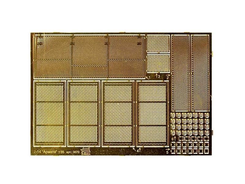 Комплект металлических фототравлёных деталей для установки на модель российского основного боевого танка «Т-14 Армата» (артикул zv-3670). Предназначены для замены пластиковых сеток, значительно улучшает вид готовой модели.