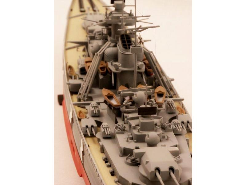 Основные и дополнительные орудия, проработанные палубные надстройки и структуры, спасательные катера и шлюпки, мачты и радары, гидросамолёт и другие подробности.