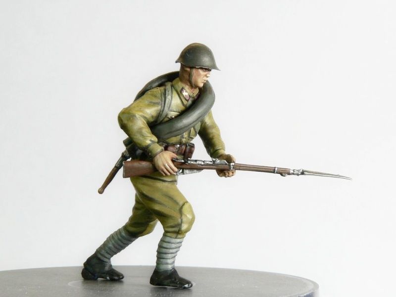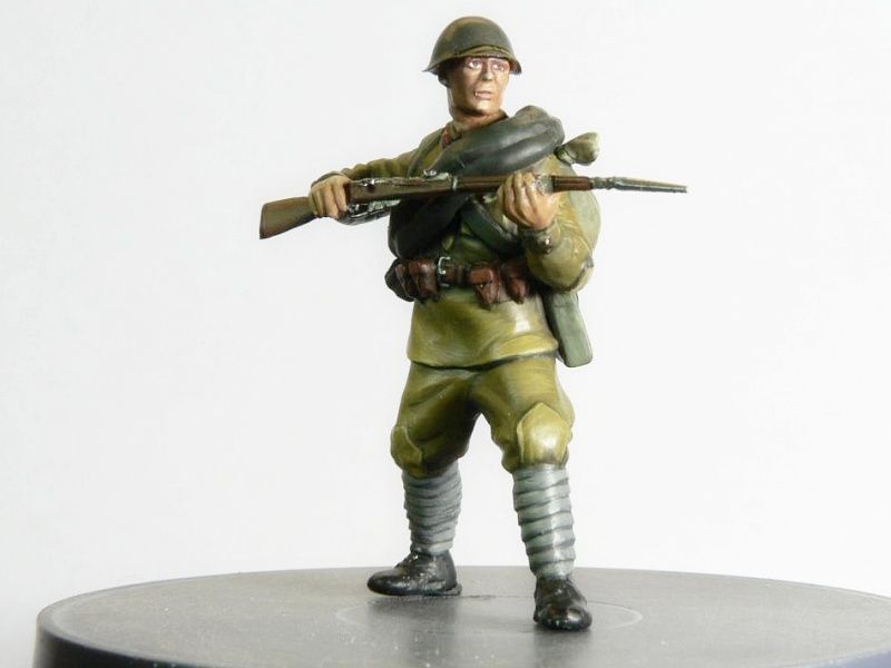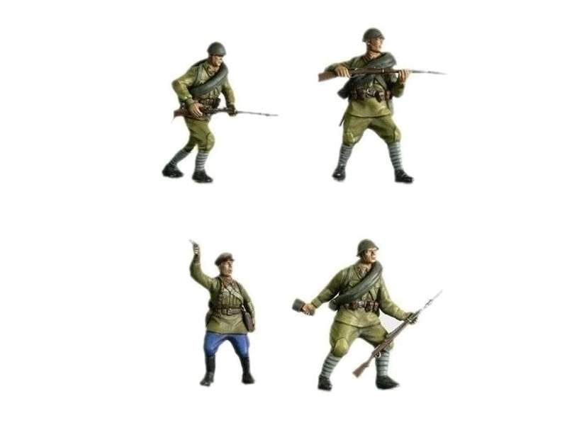 Набор деталей для сборки 4-х фигур бойцов Красной Армии в начальный период Великой Отечественной войны. Солдаты вооружены винтовками системы Мосина и Токарева. Солдатики собираются при помощи специального клея.