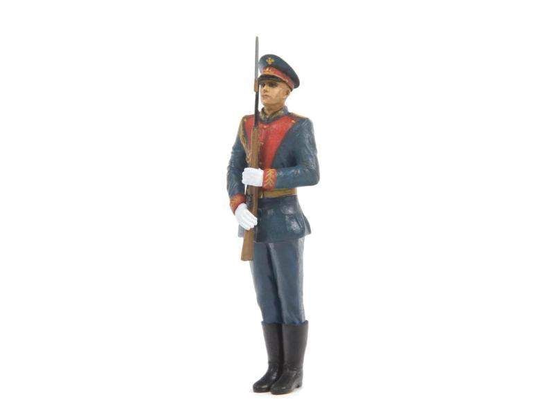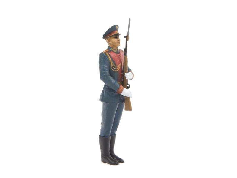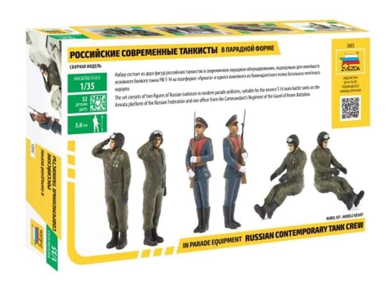 Набор состоит из двух фигур российских танкистов в современном парадном обмундировании, подходящих для новейшего основного боевого танка РФ Т-14 на платформе «Армата» и одного линейного из Комендантского полка батальона почётного караула.