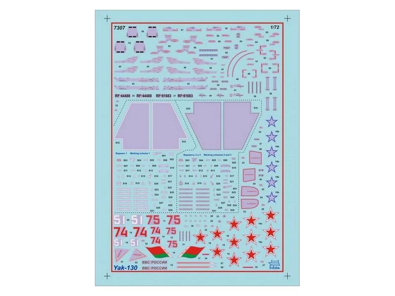 Подробная декаль с проработанной техничкой для 3 вариантов: Як-130 б/н 51 RF-44488 из состава Борисоглебского учебного авиационного центра ВКС России Воронежская область Россия 2015г., Як-130 б/н 75 RF-81683 аэродром Кубинка репетиция парада ко Дню Победы 2017г., Як-130 б/н 74 из состава 116-й Гвардейской Штурмовой Авиабазы ВВС Белоруссии аэродром Лида 2017г.