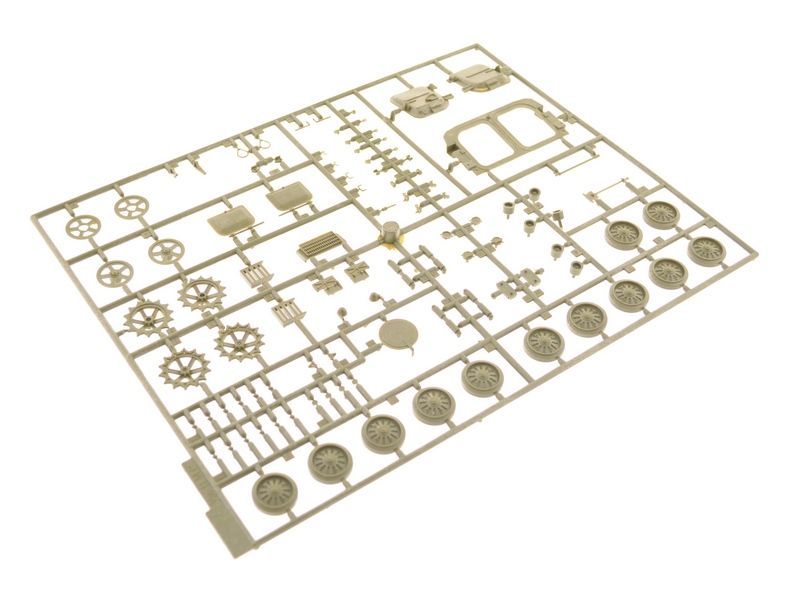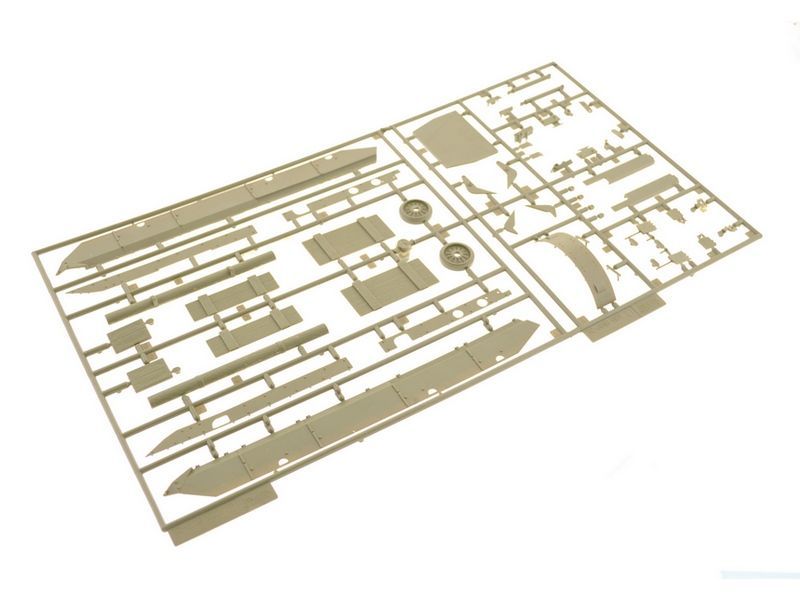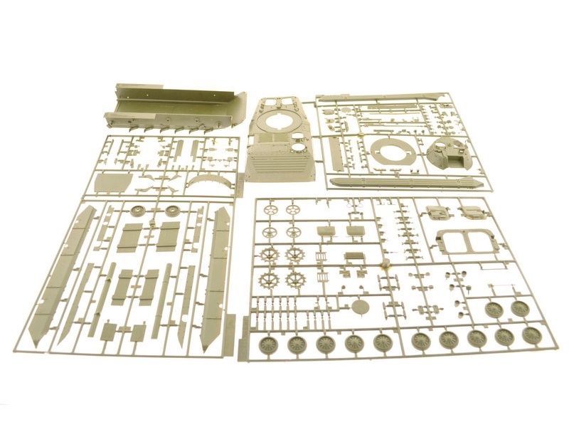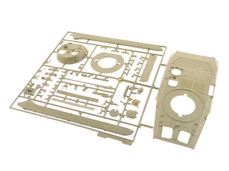 Комплект деталей из пластмассы для сборки одной модели.Детализированные корпус и башня, люки выполнены отдельными деталями.