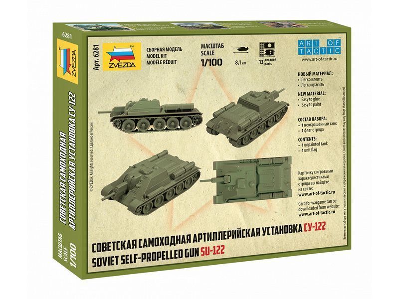 Модель СУ-122 выполнена по технологии «сборки без клея» в масштабе 1/100. Однако, для достижения высокого уровня детализации, ряд дополнительных элементов можно посадить на клей. Краски в комплект не входят.