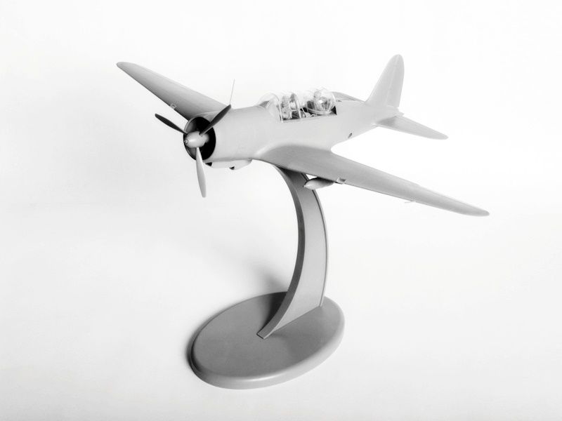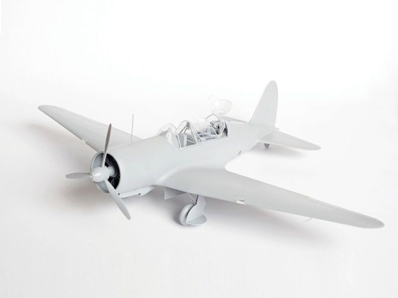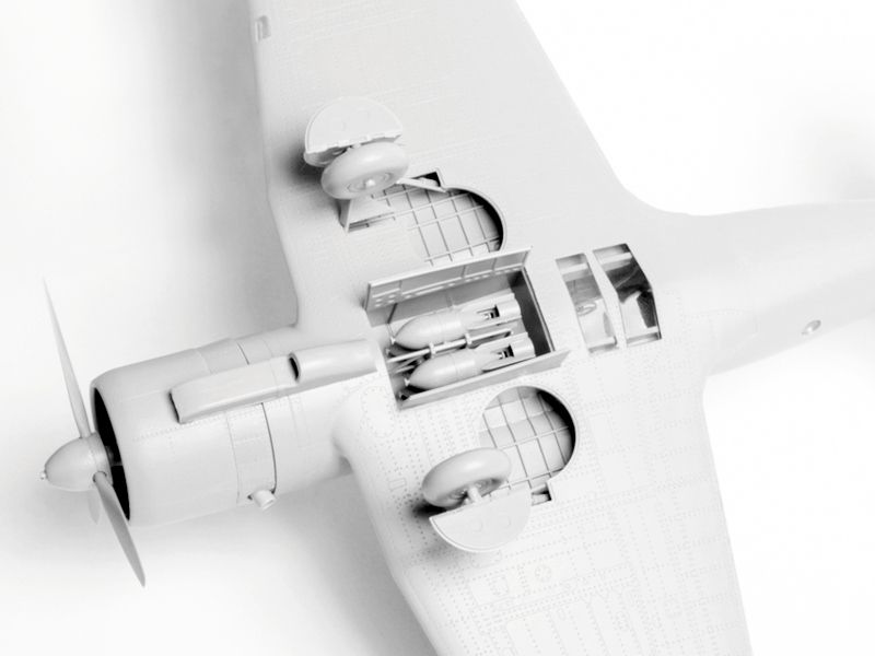Детализированный сборный двухрядный звёздообразный 14-цилиндровый двигатель, проработанный воздухозаборник, выхлоп, створки капота выполнены отдельными деталями.