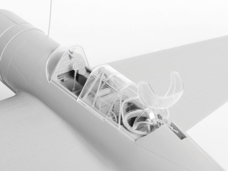 Детализированный сборный кокпит с элементами управления и панелью приборов, детально проработанные боковые стенки, фонарь на выбор открыт или закрыт.
