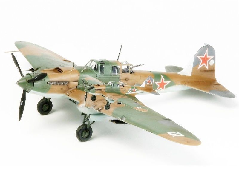 Самолет "Ил-2" обр. 1942 года. Бронированный двухместный штурмовик Ил-2, легендарная «летающая крепость», не имел аналогов ни в одной из воевавших стран и стал полной неожиданностью для противника. Разнообразный состав вооружения (два пулемета калибра 7, 62 мм, две пушки калибра 20 или 23 мм, восемь реактивных снарядов калибра 82 или 132 мм и 400-600 кг бомб) обеспечивал поражение самых различных целей: от пехоты до танков и железнодорожных составов.