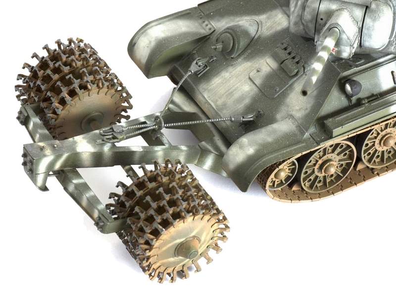 Борьба с минными заграждениями стала одной из главных проблем при ведении наступления частями Красной Армии. Для этих целей и был разработан минный трал, он устанавливался на танки Т-34 всех модификаций и самоходки на базе “тридцатьчетверок”. Он представлял собой два вала, установленные на вынесенной впереди танка платформе, которая крепилась к броне снизу под местом механика водителя.