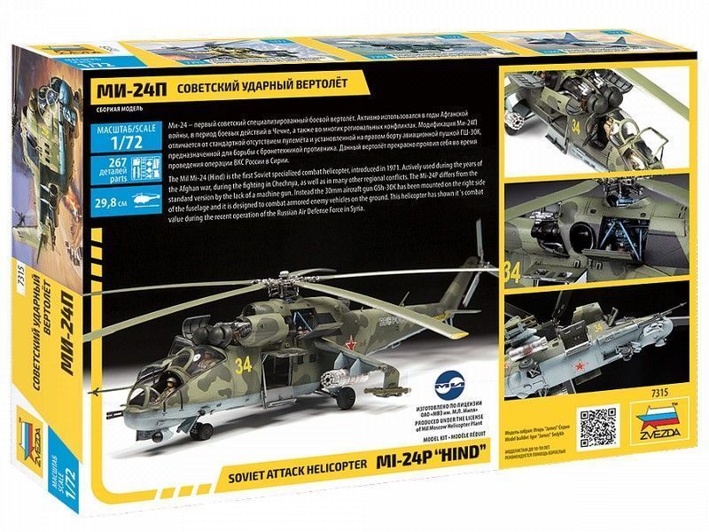 Ми-24 - первый советский специализированный боевой вертолёт. Активно использовался в годы Афганской войны, в период боевых действий в Чечне, а также во многих региональных конфликтах. Модификация Ми-24П отличается от стандартной отсутствием пулемёта и установленной на правом борту авиационной пушкой ГШ-ЗОК, предназначенной для борьбы с бронетехникой противника.