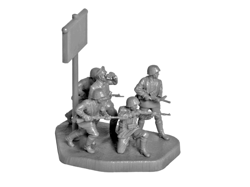 комплект пластиковых деталей для сборки 5 неокрашенных солдатиковотрядная подставка с флагом