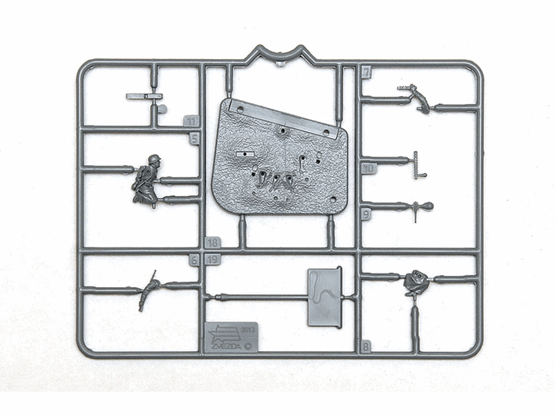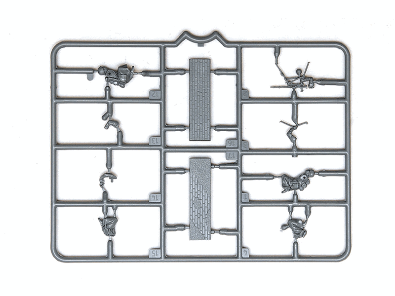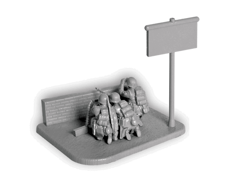 комплект пластиковых деталей для сборки 3 неокрашенных фигур и пулемётафрагмент стены