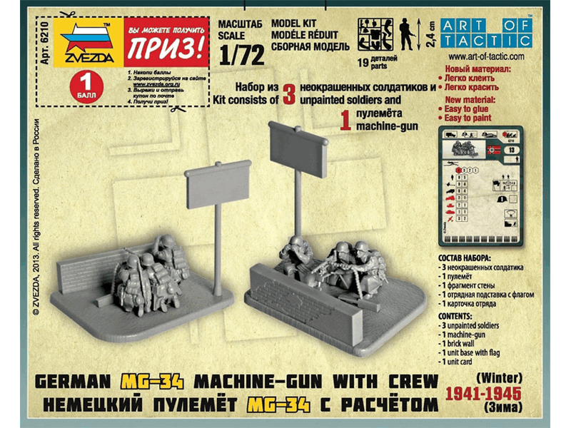 Немецкий пулемет MG-34в годы ВОВ применялся как универсальное оружие. Мог использоваться в ручном и станковом вариантах. Стараясь избегать повторений, в новом мини-наборе мы добавили антураж – кирпичную стену. Набор теперь выглядит солиднее. Что обрадует моделистов и игроков. Набор будет использоваться в игре «Битва за Москву». Покупка данного набора разнообразит игровой процесс и расширит возможности игроков.