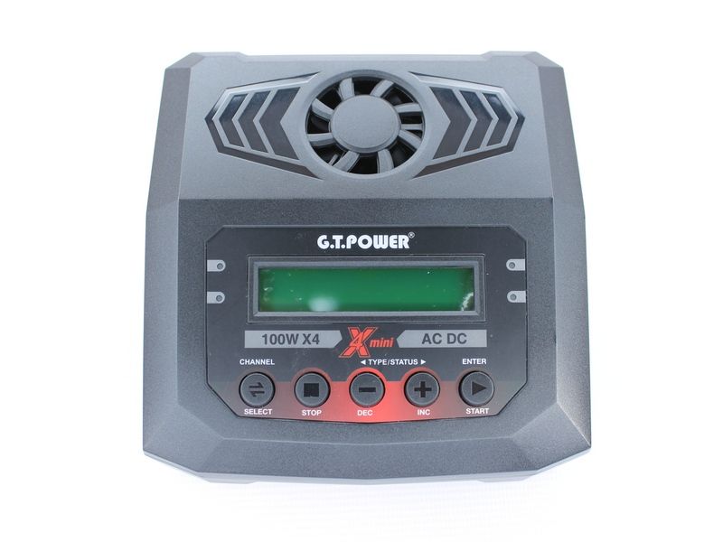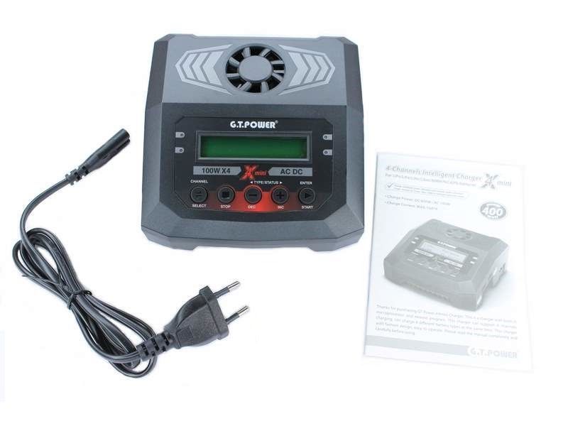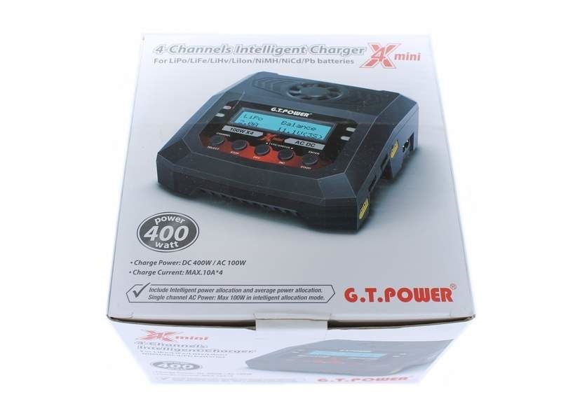 Универсальное интеллектуальное зарядное устройство G.T.Power для NiCd/NiMH, LiPo/LiFe/LiIon/LiHv, Pb батарей. Оснащено четырьмя индивидуальными схемами, позволяющими одновременно заряжать 4 батареи независимо от типа батареи и количества элементов.
